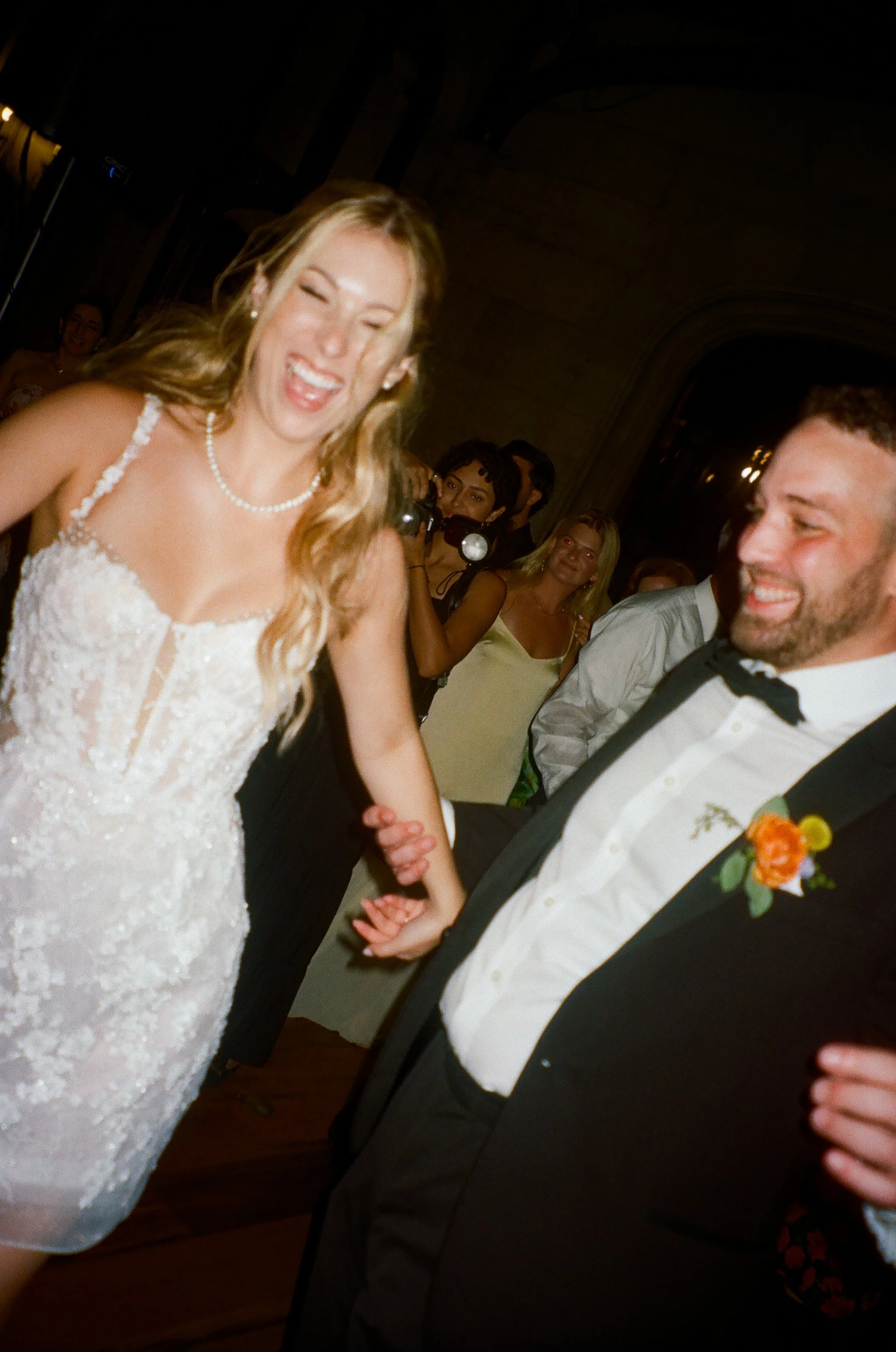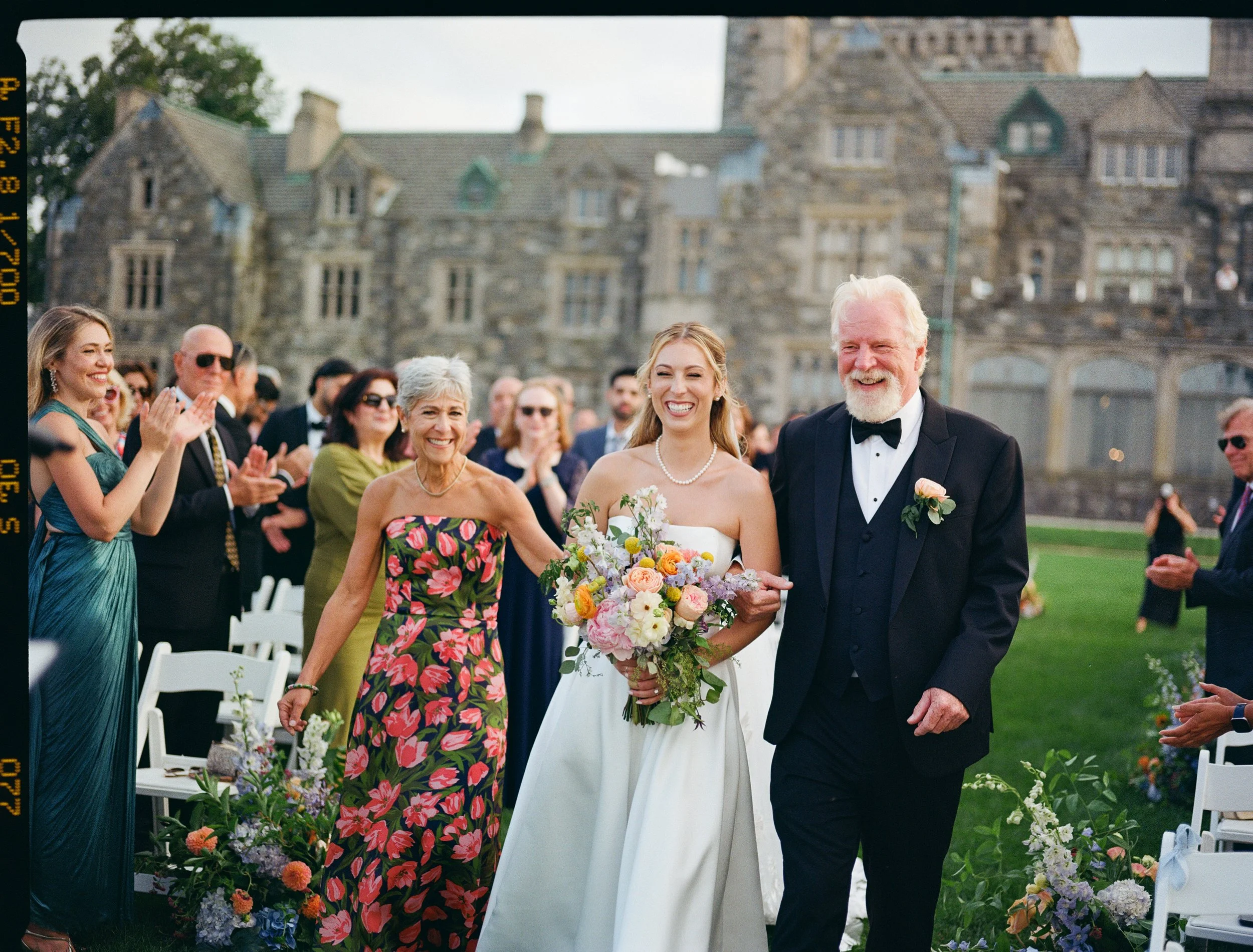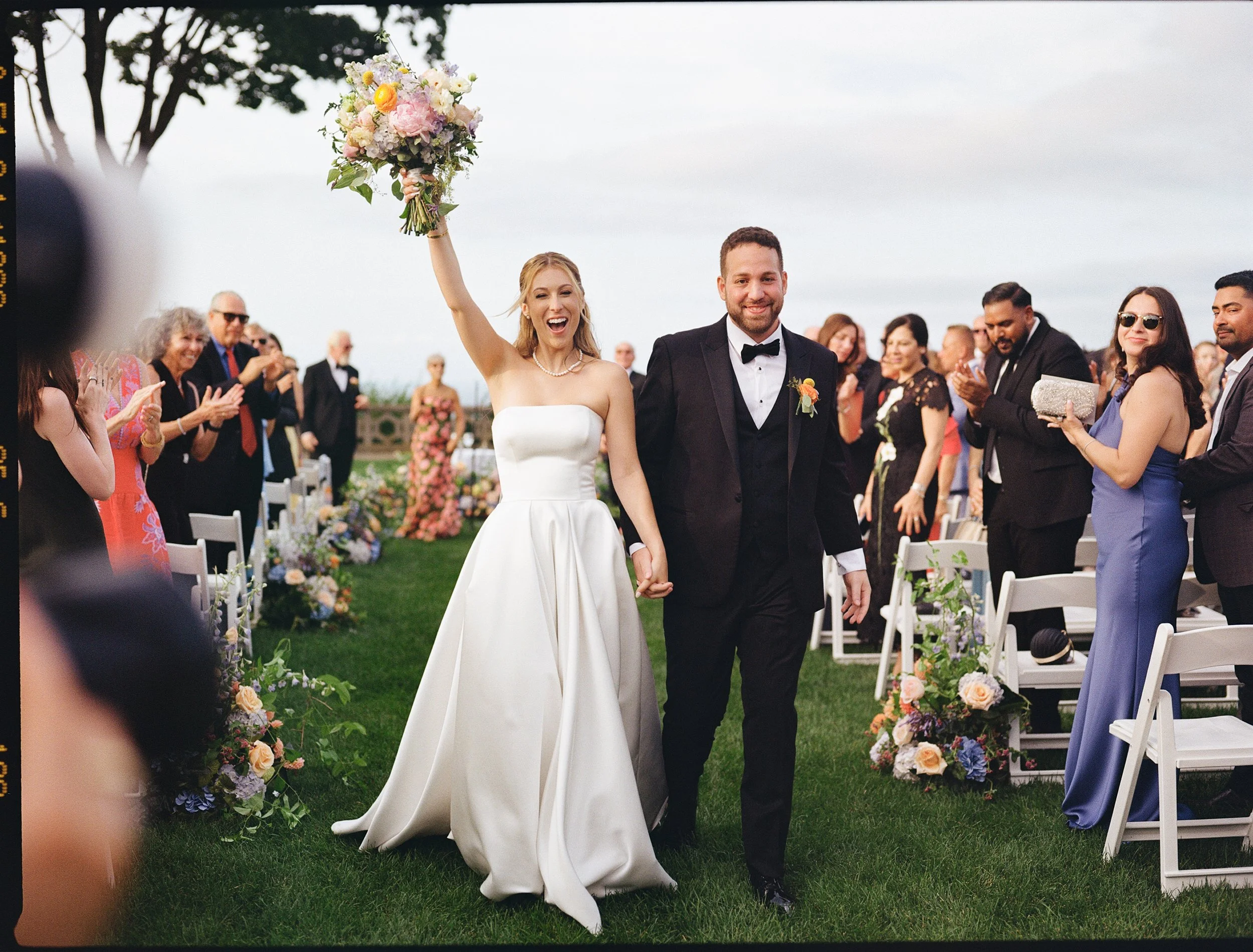 A large format film image of Devon and Jad recession out of their wedding ceremony