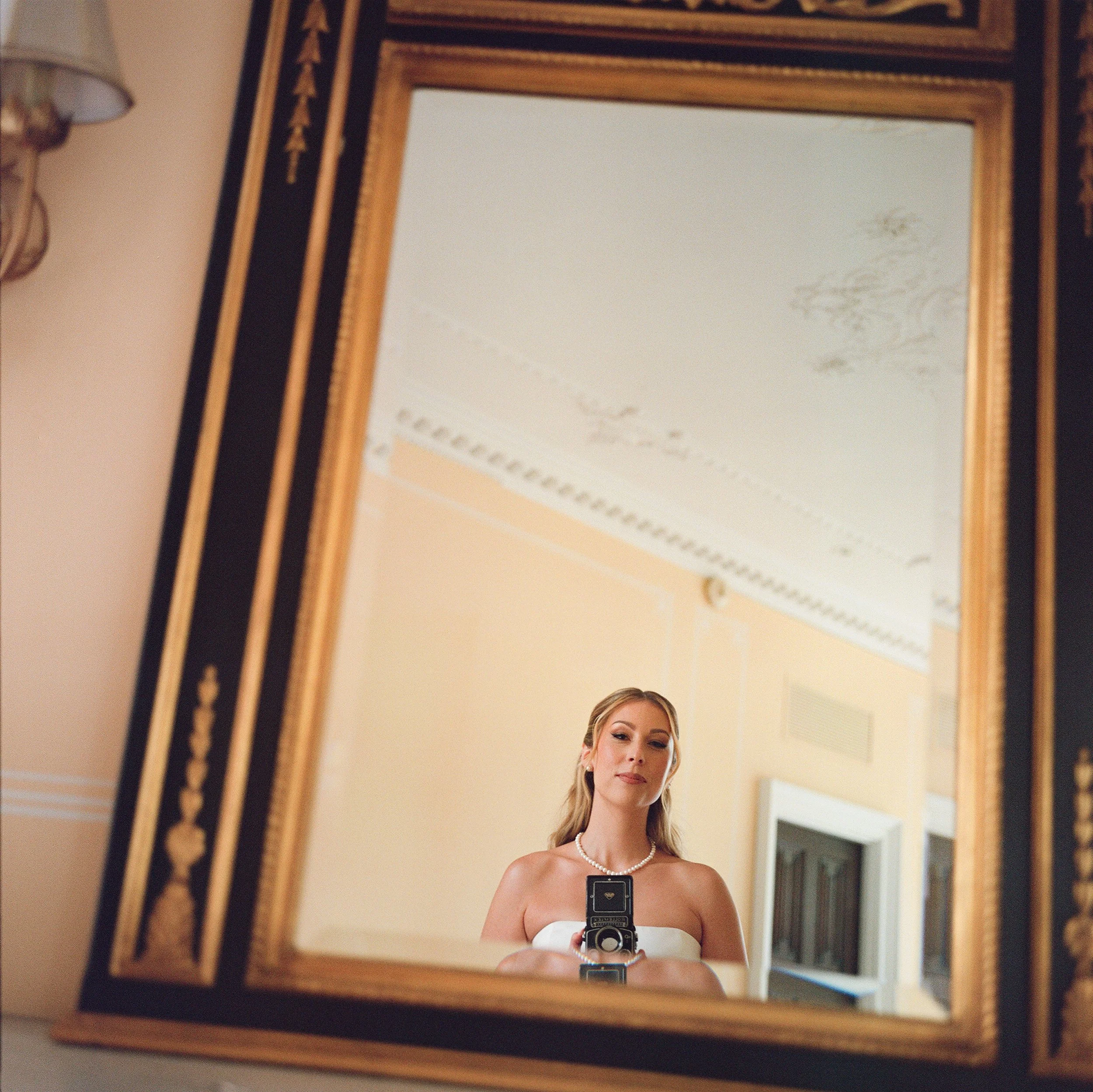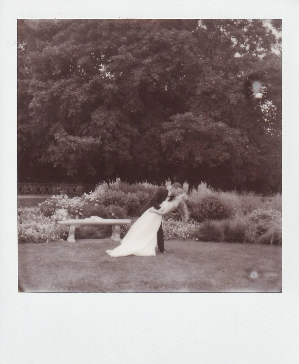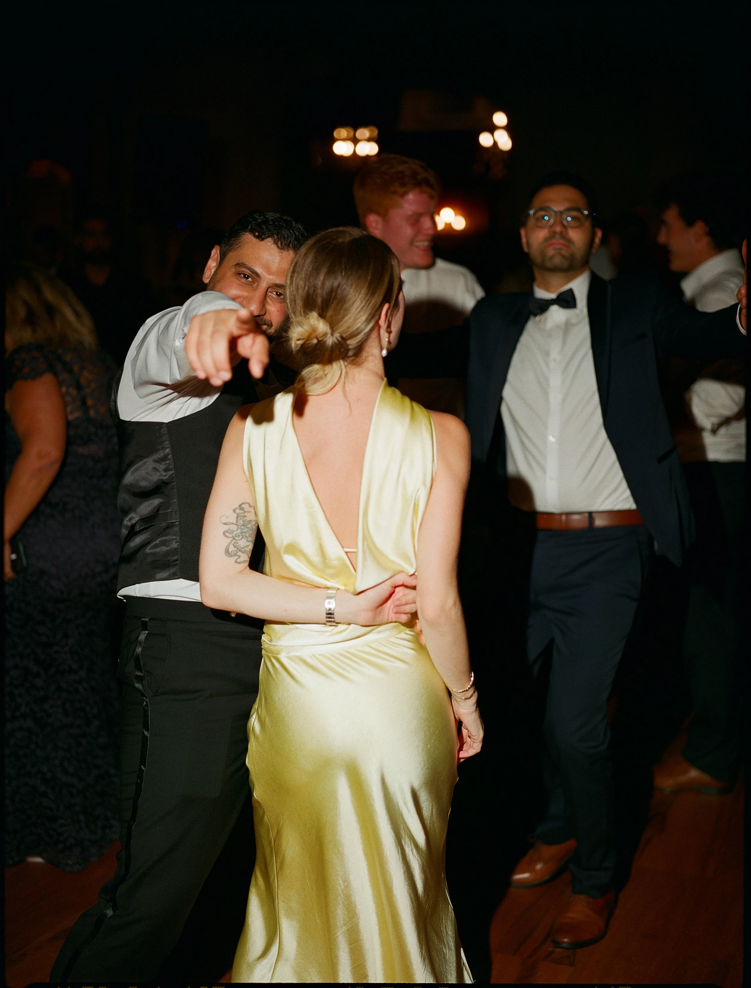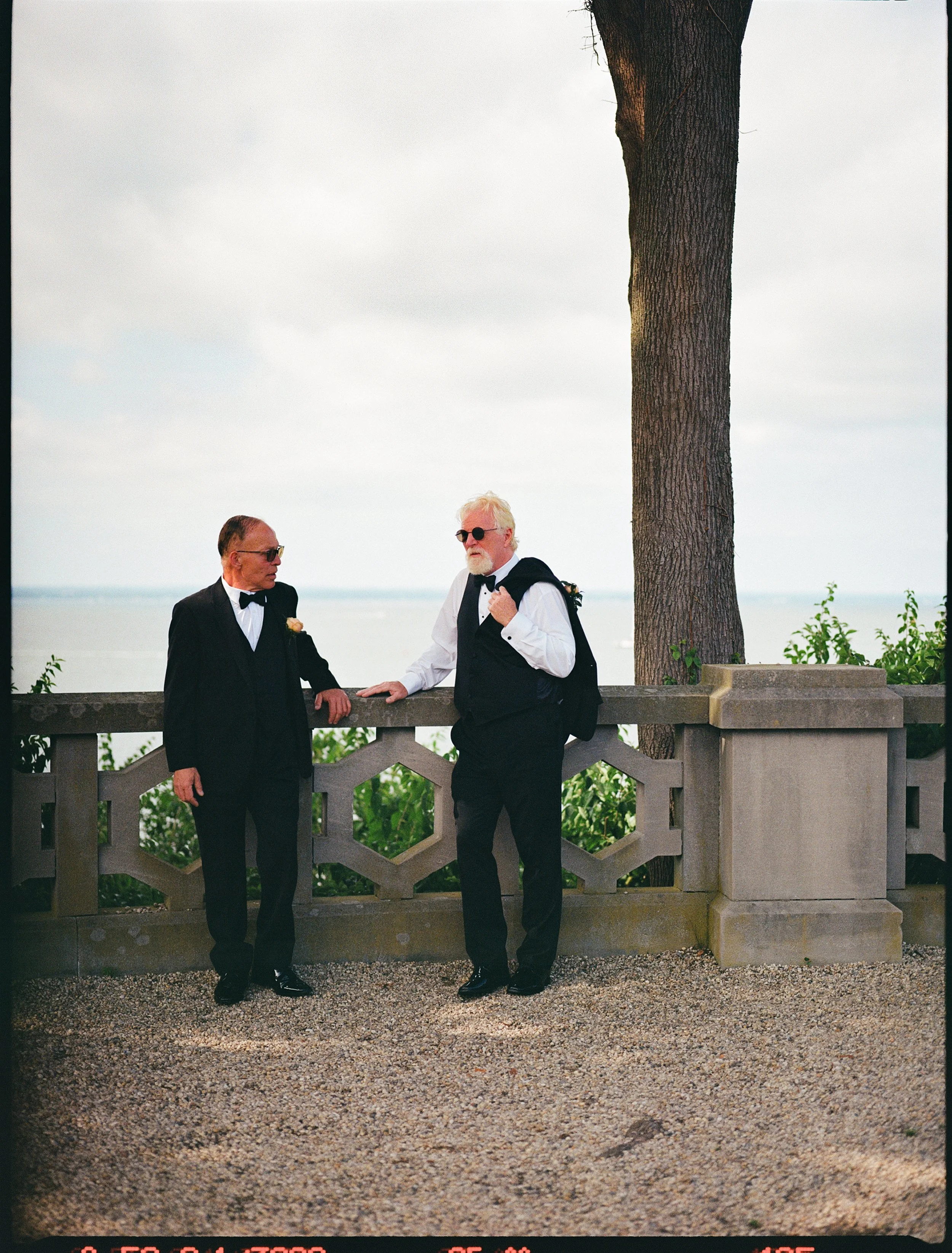 A large format film image of Devon and Jad recession out of their wedding ceremony